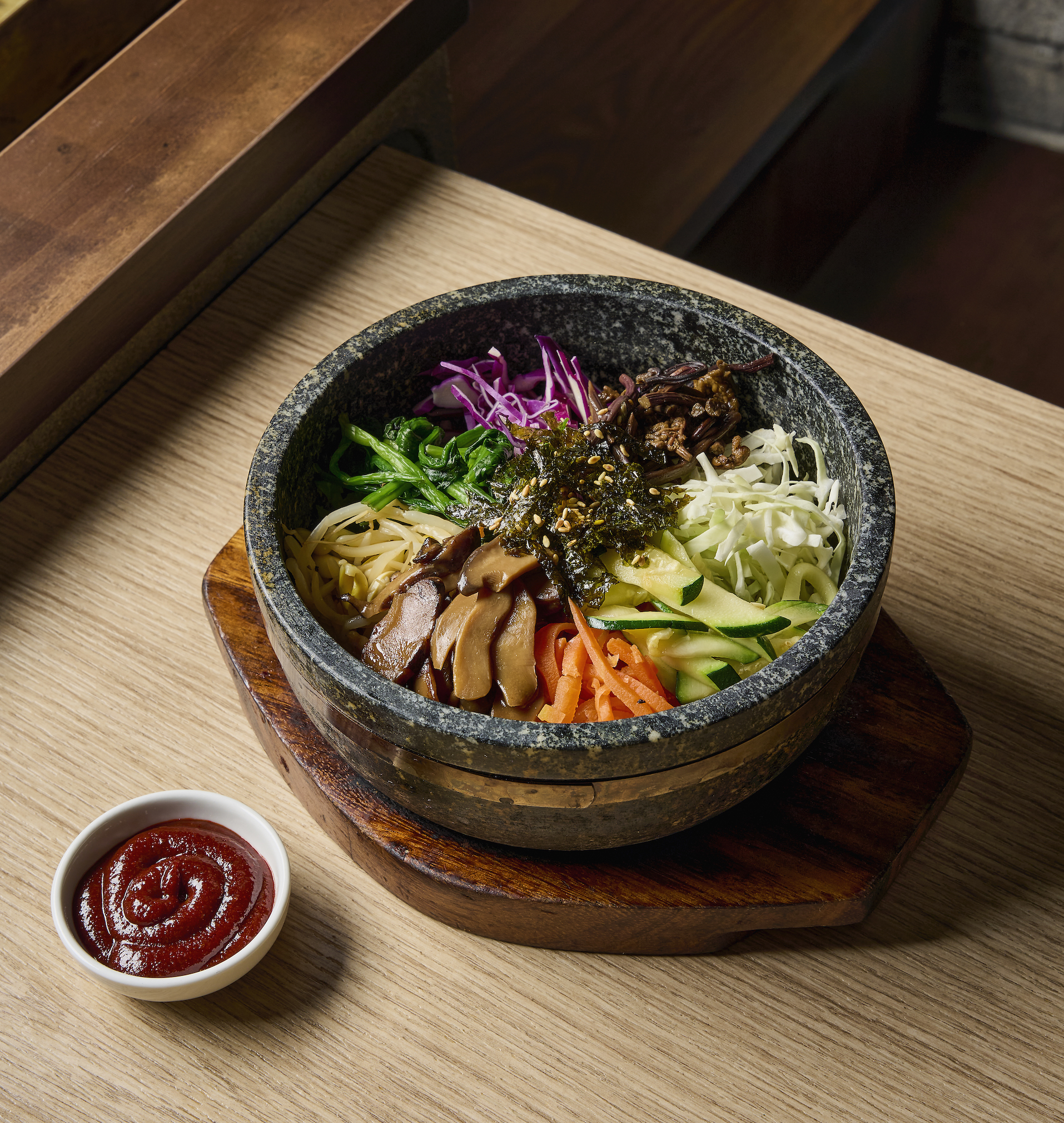 Our signature. Fragrant stir-fried mushrooms in a light soy-based sauce, one of Korean temple cuisine, with a touch of sesame oil for a naturally wholesome flavor.