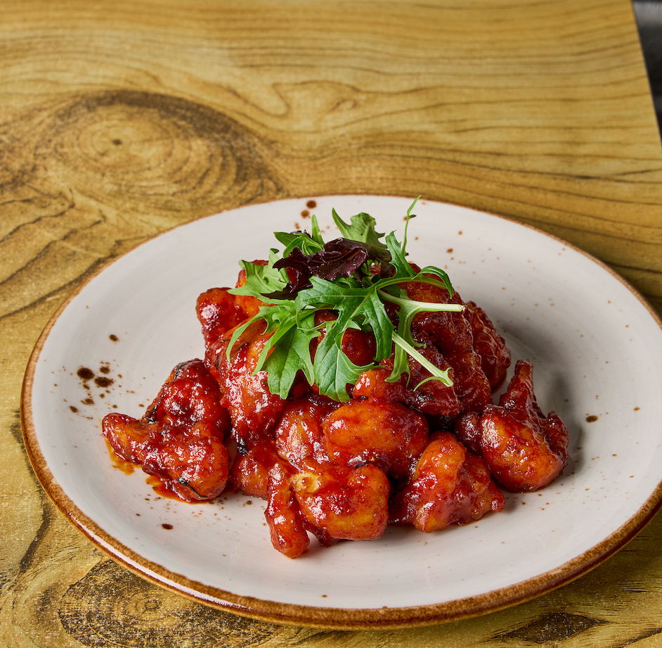 Korean style lightly battered cauliflower dish coated in a sticky, spicy sweet gochujang glaze.